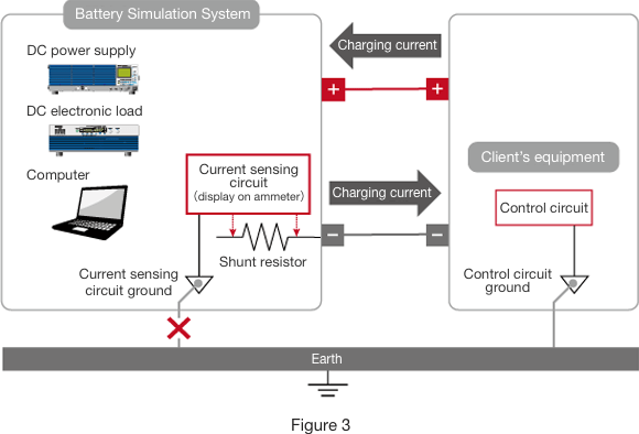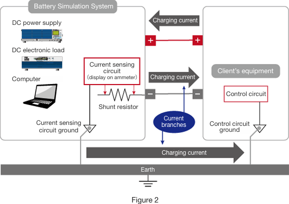 On close observation of the customer’s circuit diagram, I noticed that the customer’s equipment was grounded. The current sensing circuit in our system was also grounded. In electronics, ground (GND) denotes a reference potential. Despite what you might think in the case of electronic circuits, a device that is ’grounded’ is not necessarily earthed, or connected to the earth, although for reasons of safety and the prevention of signal noise, earthing is generally performed. It follows that grounding our system would have been a reasonable step to take, had the customer’s system and our system been independent of each other. However, the two systems needed to be connected, and when the two ground lines were connected to each other, a new circuit, separate from the circuit carrying the shunt current, was formed on the negative power line. That is, the charging current branched in two. The difference between the current displayed on the meter and the selected input current was due to the subtraction of this branch current. (Figure 2)