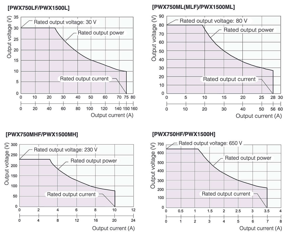 A wide range of voltage and current settings can be combined within its output power rating (3 times). For example, the output power of 1500 W model, the PWX1500ML is capable to operate seamlessly from the range of “80 V-18.75 A” to “26.8 V-56 A”.