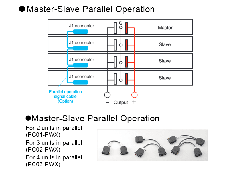 In master-slave parallel operation, one unit is the master unit, and all other units connected in parallel are slave units. The master and slave units must all be the same model. You can control the whole system by operating the master. You can use master-slave parallel operation to increase the output current (maximum output current: the rated output current of one unit × the number of units connected in parallel). You can connect up to four units, including the master, in parallel. The dif ference in the output voltage and output current between the master unit and the slave u n i t s i s w i t h i n approximately 5 % of the rating.