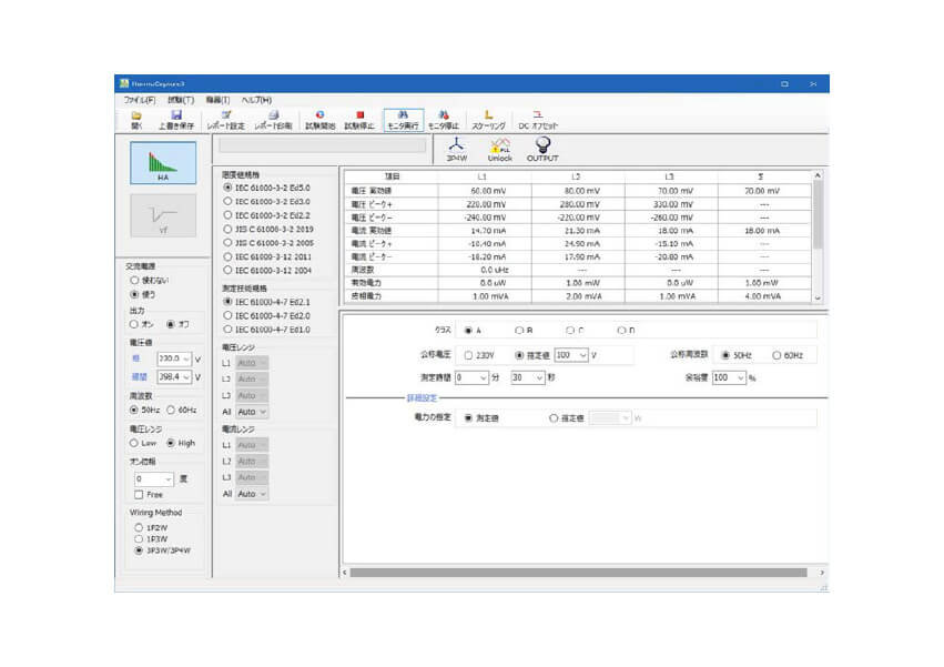 This dedicated application software consists of 3 programs. Using this software, you can set test conditions and control the execution of tests. You can also control the AC power supply (PCR-LE) used for tests. Furthermore, you can print the harmonic spectrum, and current and voltage waveforms on your reports.